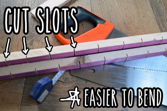 This wood I used for the roof beams was a bit deeper (to make it level with the metal strut) so I cut slots at even intervals to help them bend easier to the curve of the roof as shown in the picture.