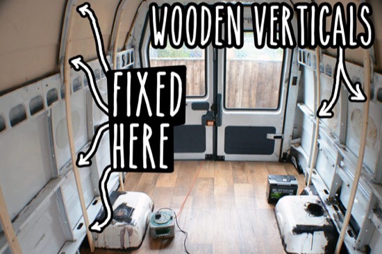 For the vertical beams I used lengths of pine that were just thin enough to bend to the curve of the van wall, but still strong and deep enough for the cladding to screw into. I screwed these into the existing steel ribs of the van at the points marked with the arrows.