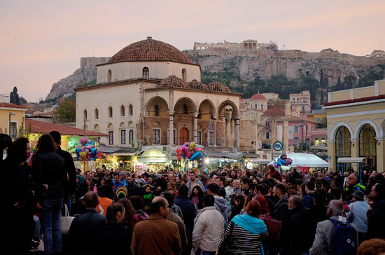 Theyโve gone to a lot of effort with the graffiti. Some is crap, some is geniusAreopagus Hill aka Mars Hill. Looking West-ishThereโs a lot of this In AthensI liked this guys paintings (and his glasses). I donโt remember what the shop was called though. Was in the Plaka or Psirri area maybeMount Lykavitos โ the highest point in the city at 277m above sea level. The view is from Areopagus Hill, looking North-ishIโve wanted a bouzouki ever since I got my hands on that bouzouki instrumentals cassette tape when I was 10Avissynias Square, in the flea-market neighbourhood of MonastirakiMan playing a music box on Mitropoleos StreetSyntagma Square, looking towards the parliament buildingView of the Acropolis from Filopappou HillThis just sums Athens up; inked yet beautifulThe Gate of Athena Archegetis in the Roman Forum. I know what a Doric column is now. The Acropolis is in the backgroundRoman forum, with a view of the back of the gate of Athena ArchegetisA man standing and another man playing music. Interesting