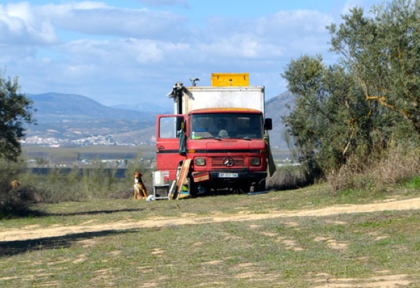 We followed this van for about 10 miles from Granada.ย After about 10 minutes down the track and a quick stop to look in the van and questioning by the guardia civil, we passed a guy sat outside by his truck on the roadside who seemed to be greeting everyone coming through.