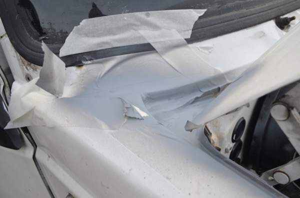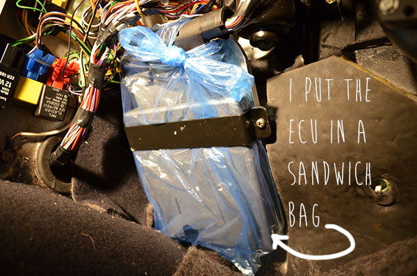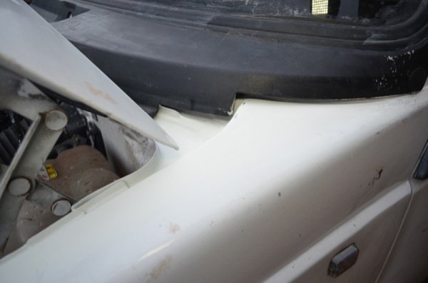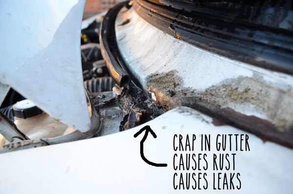 The picture above shows a puddle of water next to the central console right under where the water pipe comes in for the heating matrix–one assumption would be that the pipe has a leak and thats exactly what I (wrongly) thought. I reckon the only way to get the bottom (top) of a leak is to get the garden hose out. The water was actually coming in at the top corner of the wing, above the wheel arch. I never would have guessed.